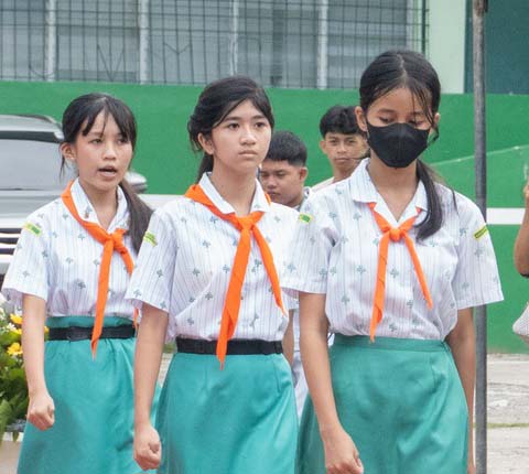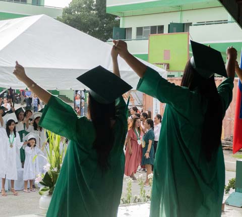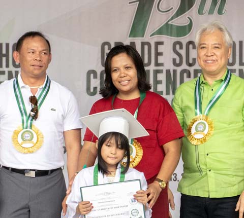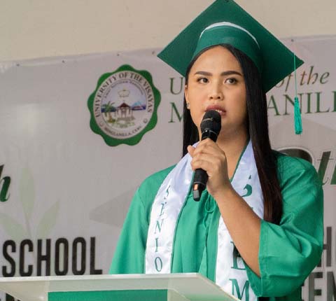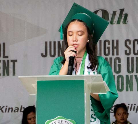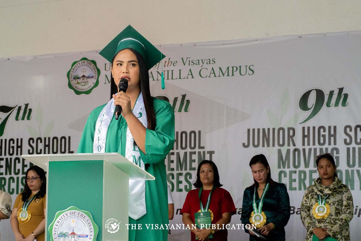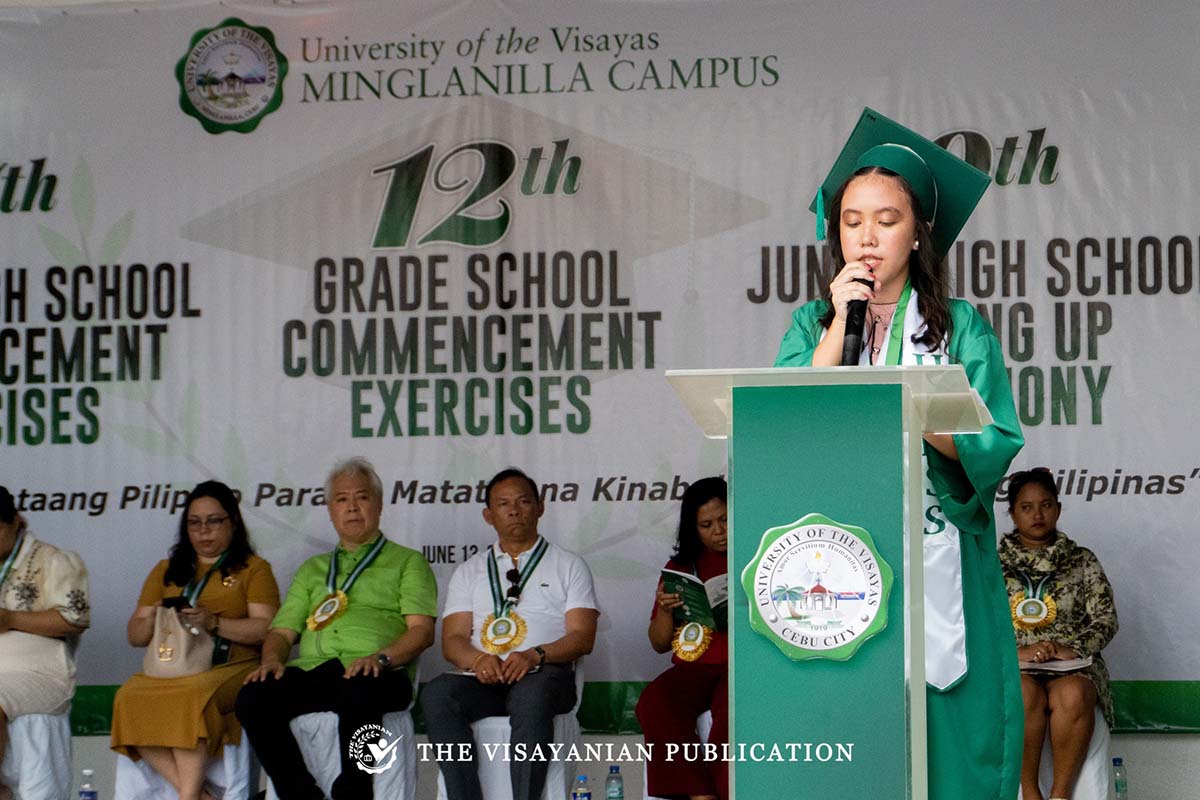 The address of gratitude was given by the valedictorians of the graduating batches: Grade 12 HUMMS student Jellian Mae Manacap, and Grade 6 student Jane Cris Alexa Meguiso.